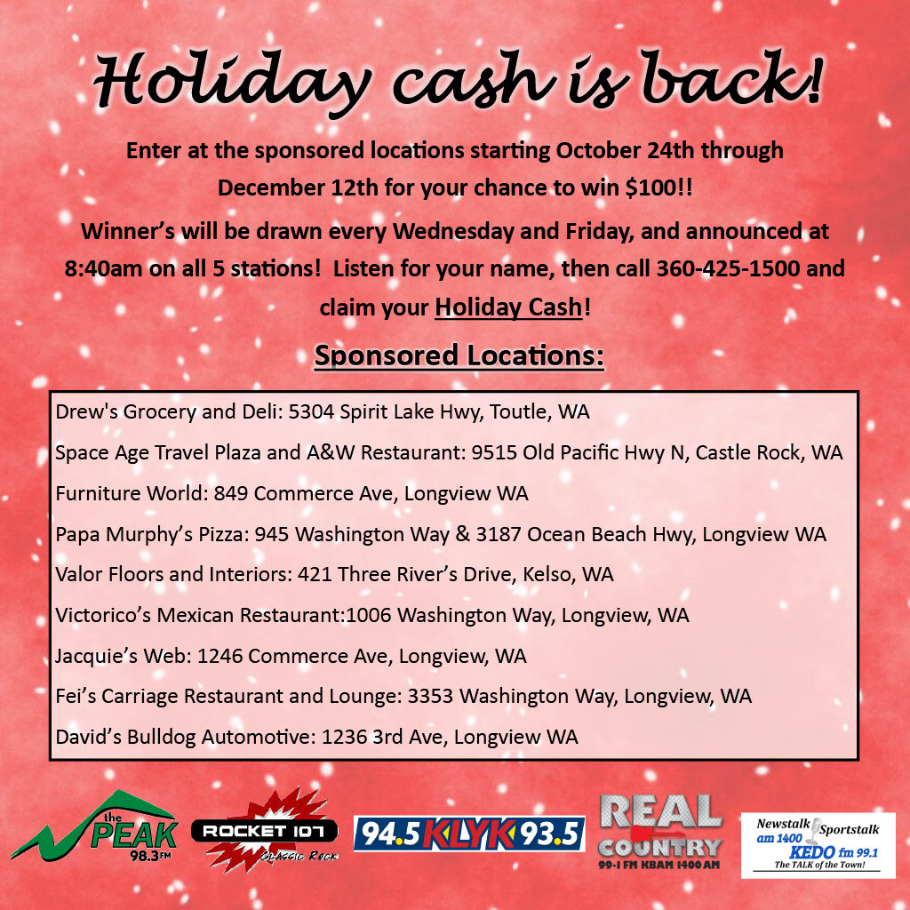 Enter through December 12th for your chance to win $100. We will draw a winner every Wednesday and Friday at 8:40 AM during the Big D & Bubba Show. Listen for your name, if you hear your name, then call us within 100 minutes at 360-425-1500 and claim your Holiday Cash. The full list of sponsor locations is on our Facebook.